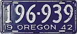 1942–45 Embossed white serial on blue plate with border line; "19 OREGON 42" at bottom 123-456 1 to approximately 495-000 Revalidated for 1943, 1944 and 1945 with windshield stickers, due to metal conservation for World War II.
