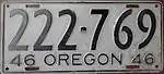 1946 Embossed black serial on gray plate with border line; "46 OREGON 46" at bottom 123-456 1 to approximately 480-000 Only rear plates issued due to ongoing metal shortages. A windshield sticker was carried at the front of the vehicle.