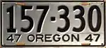 1947 Embossed black serial on unpainted aluminum plate with border line; "47 OREGON 47" at bottom 123-456 1 to approximately 458-000
