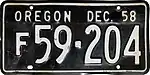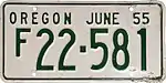 In 1956, the United States, Canada, and Mexico came to an agreement with the American Association of Motor Vehicle Administrators, the Automobile Manufacturers Association and the National Safety Council that standardized the size for license plates for vehicles (except those for motorcycles) at 6 inches (15 cm) in height by 12 inches (30 cm) in width, with standardized mounting holes.[2] The 1955 (dated 1956) issue was the first Oregon license plate that complied with these standards.