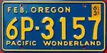 Embossed orange serial on black plate; "OREGON EXPIRES JUNE 30 1931" at bottom 123-456 1 to approximately 296-000