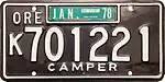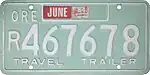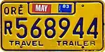 Travel Trailer c. 1964–73 White on pistachio green; "ORE" and sticker box at top and "TRAVEL TRAILER" at bottom R123456 R400001 to approximately R499500