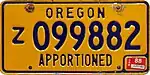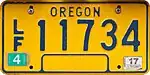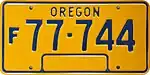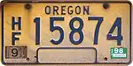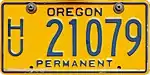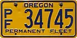 Permanent Fleet c. 1973–2004 Blue on gold; "PERMANENT FLEET" at top and "OREGON" at bottom P/F 12345 P/F 00001 to approximately P/F 27000 Issued to owners of fleets of 50 or more vehicles used within Oregon. Fleet vehicles can be passenger cars, trucks, buses or utility trailers.