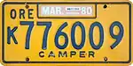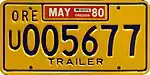 Utility Trailer c. 1979–83 Blue on gold; "ORE" and sticker box at top and "TRAILER" at bottom U123456 U000001 to approximately U041000 Issued to trailers having a loaded weight of 8,000 lb or less.
