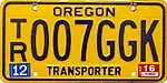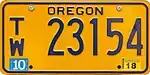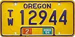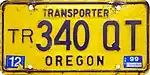 Tow Truck Blue on gold; "OREGON" at top T/W 12345 T/W 00001 to present Issued to individuals who tow vehicles not owned by them in tow and recovery operations for direct or indirect compensation. Also issued to businesses which must transport damaged, disabled or abandoned vehicles.