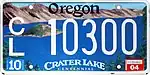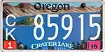 Crater Lake Centennial 2002–2022 White on multicolored background. Surface-printed serials. Discontinued September 9, 2022. C/L 12345 C/L 00001 to C/L 99999 Awarded "Plate of the Year" for best new license plate of 2002 by the Automobile License Plate Collectors Association, the second time Oregon was so honored. Surcharge supports Crater Lake National Park.