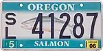 Salmon 1998–2021 Dark blue on multicolored background. Embossed serials. Discontinued September 1, 2021. S/L 12345 S/L 00001 to S/L 93326 (as of May 8, 2021) $30 surcharge supports the Oregon Watershed Enhancement Board and the Oregon Parks and Recreation Department and is charged at each renewal time (every two years). First available in February 1998, the Salmon design has been less popular than had been expected, and by 2002 had only raised about one-third as much revenue as originally predicted.[6]