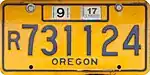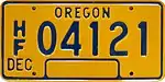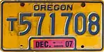 For-Rent Blue on gold; "OREGON" at top and "DEC." and year of expiration at bottom F/R 1-2345 Issued to trailers having a loaded weight of 8,000 lb or less that are for hire and are equipped with pneumatic tires. All plates expire on December 31 of the stated year.