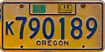 1973–85 Embossed blue serial on golden yellow plate; border line around plate and around registration year sticker spot at bottom right; "OREGON" centered at bottom; month of expiration at bottom left none ABC 123 First letter corresponds to month of expiration Serials for each month continued from where the 1964–73 plates left off.