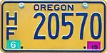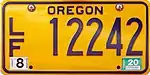 Low-Speed Vehicle Blue on gold; "OREGON" at top and sticker box at bottom L/S 12345 L/S 00001 to ? Issued to four-wheeled vehicles with a maximum speed of between 20 and 25 miles per hour.
