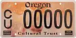 Cultural Trust 2006–2021 Black on multicolored background. Embossed serials. Discontinued October 1, 2021. C/U 12345 C/U 00001 to present Surcharge supports the Oregon Cultural Trust.