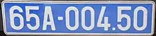Vehicle registration plates of Vietnam generally take the form DDL-DDDDD for vehicles. Standard license plates have black characters on white background. Front plates measure 47 × 11 cm, rear ones are 27 × 20. In 2020 and 2021, both plates measure 6 x 12. The current scheme for civilian vehicles omits the letters I, J, O, Q and W, with the letter R reserved for trailers, and includes the Vietnamese D.