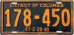 January 1, 1939 – February 29, 1940 | Embossed golden yellow serial on black plate with border line; "DISTRICT OF COLUMBIA" and "EX-2-29-40" centered at top and bottom respectively | none | 123-456 | 46-001 to approximately 174-000 | |