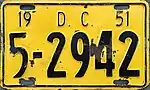 April 1, 1951 – March 31, 1952 | Embossed black serial on golden yellow plate with border line; "19 D.C. 51" at top | none | 1234 | 1 to 9999 | |