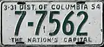 April 1, 1953 – March 31, 1955 | Embossed dark green serial on white plate with border line; "DIST. OF COLUMBIA" centered at top; "3-31" at top left and "54" at top right | "THE NATION'S CAPITAL" centered at bottom | 1234 | 1 to 9999 | Revalidated through March 31, 1955, with dark green tabs. |