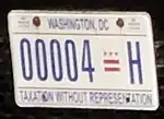 Since November 2000, the standard Washington, D.C. license plate design has featured some form of the slogan "Taxation Without Representation", referring to the circumstance that the district's residents face, in common with U.S. territories, in which they must pay federal income tax but cannot elect a voting member of the United States Congress.[5]