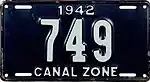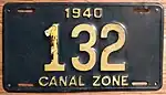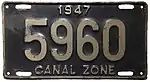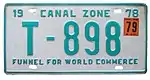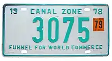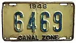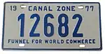 The former U.S. territory of the Canal Zone first issued license plates in 1910, and this continued until the Canal Zone was returned to Panama in 1979.[1] A single plate was issued for all years. The country of Panama also issued Canal Zone license plates for United States citizens that lived in Panama but worked in the Canal Zone, but these plates have the country name "Panama" clearly showing on them.[2] Since reciprocity for license plates between the Canal Zone and Panama did not exist until 1950, old photos often show local vehicles with two different license plates mounted on the vehicle.[3]