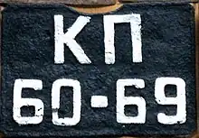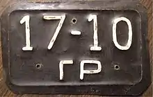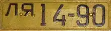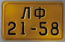 Vehicle registration plates (Russian: Регистрационные знаки транспортных средств, Registratsionnye znaki transportnykh sredstv, lit.'Registration Plates of Vehicles') were used in the Soviet Union for registrations of automobiles, motorcycles, heavy machinery, special-use vehicles as well as construction equipment, military vehicles and trailers. Every vehicle registration plate contains a unique registration mark embossed on a metal plate or a plate made of other materials. All vehicles were required to display the plates on the front side and backside, with the exception of trailers and motorcycles, which were only required to display one on the backside.