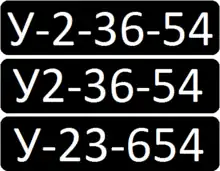 At the end of 1936 the format changed once more, when the beginning of the sequence switched to a two-letter code of the regional registry, followed by two pairs of numbers separated by a hyphen, which made it an "LL NN-NN" pattern. The code uses letters of the Russian alphabet except for "Ё", "Й", "Ъ", "Ы" and "Ь". There was a single-line frontal plate plus a double-line rear plate for each vehicles, with motorcycle plates bearing the same format, albeit in a smaller size. This difference existed until 1994. Trial and transit numbers also remained, which replaced the region code with the word "транзит" (tranzit, "transit"), below which positioned a factory code.