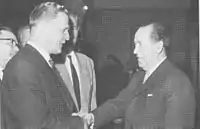Helle was originally a carpenter by trade and followed his father into municipal politics and later into the parliament. He was elected in the 1936 municipal elections and he served as a member of parliament from 1951 to 1983. He was four times a minister between 1970 and 1983 and the speaker of the parliament from 1976 to 1978.[1] Helle ran in the elections for SDP chairman in 1963, losing the post to Rafael Paasio. In the inner party politics, he represented the right-wing of the SDP.