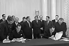 24 January 1966. Helenius (seated, left) signs a Soviet-Finnish consular convention. His counterpart, Soviet diplomat Oleg Khlestov, is seated right.