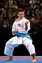 The flagbearers for Venezuela were chosen by popular vote, with one male and one female representative to be flagbearers: karateka Antonio Díaz and triple jumper Yulimar Rojas were selected.[26] The voting program, called "Abanderado por el Pueblo" ("The People's Flagbearers"), was devised by the COV in May 2021.[27] On 22 July 2021, the day before the opening ceremony, Rojas was still slated to be a flagbearer,[28] but she did not appear at the ceremony.[29] Judoka Karen León walked alongside Díaz at the opening ceremony, but did not carry the flag.[30][1] Díaz was the only karateka flagbearer, and both he and Antonio Espinós, president of the World Karate Federation (WKF), felt proud to have a representative for the sport featured in the opening ceremony,[26] with Espinós saying that the WKF "couldn't have asked for a better ambassador for karate".[1]