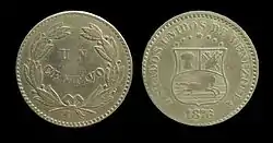 Given the inability of previous governments to order enough coins from the mints in Paris, London, and United States to meet demand, many foreign and demonetised coins circulated that were prone to perforations, scratches, chipping, or smoothing beyond recognition.[1] The monetary law of 11 May 1871 replaced the peso (the only one of the coins in circulation that was legal tender) with the venezolano at par. Coins were minted by several banks including la Compañía de Crédito (lit. The Credit Company) and Estado de Guayana (lit. State of Guiana) following a pattern of copper, nickel, silver and gold.