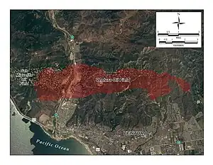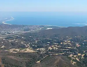 The oil field is on and beneath the ranges of hills northwest, north and northeast of the city of Ventura. The Ventura River, flowing down from Ojai, cuts through the field, and empties into the Pacific Ocean at Ventura. Native vegetation in the hills is predominantly chaparral and coastal sage scrub, and riparian woodland is found along the course of the Ventura River.[4] Terrain on the hills is steep, and the roads to well pads, tanks, and other infrastructure make numerous switchbacks. Most of the field is hidden from view from the city because of the first steep range of hills. The oil field is one of several following the east-west trend of the Transverse Ranges at this point: to the west are the San Miguelito Oil Field and the Rincon Oil Field, and to the east, across the Santa Clara River valley, the large South Mountain Oil Field adjacent to Santa Paula and the smaller Saticoy Oil Field along the Santa Clara River east of Saticoy. To the north are the smaller Ojai and Santa Paula fields. Total productive area of the field, projected to the surface, encompasses 3,410 acres (13.8 km2).[5]
