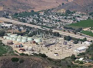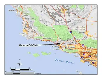 The Ventura Oil Field is a large and currently productive oil field in the hills immediately north of the city of Ventura in southern California in the United States. It is bisected by California State Route 33, the freeway connecting Ventura to Ojai, and is about eight miles (13 km) long by two across, with the long axis aligned east to west. Discovered in 1919, and with a cumulative production of just under a billion barrels of oil as of 2008, it is the tenth-largest producing oil field in California,[1] retaining approximately 50 million barrels in reserve, and had 423 wells still producing.[2] As of 2009 it was entirely operated by Aera Energy LLC.[3]