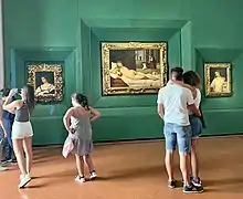 In 1624, as the Papacy moved to fully annex the duchy to the Papal States, the della Rovere court moved to Pesaro, where the painting hung in the Villa Imperiale. It joined the Medici family collections in 1633 when the last della Rovere, Vittoria della Rovere, married Ferdinando II de' Medici, Grand Duke of Tuscany. It was moved to the Uffizi in 1736, and has remained there ever since, apart from visits to exhibitions which in the 21st century have included Madrid, Brussels, Tokyo, Venice, and Urbino.[12] It has long been famous, as is shown by its prominent placing at the front of the gallery group portrait by Johan Zoffany of the Tribuna of the Uffizi of the 1770s.