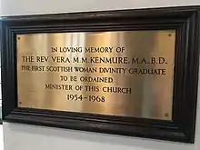 Vera Mary Muir Kenmure born Vera Mary Muir Findley (13 February 1904 – 27 December 1973) was a British Congregational minister. She was the first woman minister ordained in Scotland to be in charge of a church. She founded her own church in Partick after objections were raised, by some of her congregation, to her becoming a mother while still a minister.