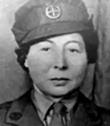 When Paris fell in 1940 she left for Lyon to join her fiancé of seven years, a M. Charles Sussaix, the managing director of a Portuguese-owned film company.[4] She had intended to find a way, with his help, to get to England, but she became involved with the underground escape lines guiding fugitive Allied servicemen out of the country and it was not until 1942 that she herself took the route over the Pyrenees into Spain.[4] As with many who made this journey, Spanish authorities put her in the internment camp at Miranda de Ebro, about 65 kilometres south of Bilbao.[5] Through the efforts of a British embassy official, she was released, and helped to make her way to England via Gibraltar.[6]