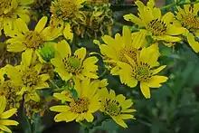 This is a subshrub growing 50 centimeters to over a meter in height. The green leaves are oppositely arranged and have oval blades up to 12 centimeters long by 6 wide. They are hairless to roughly hairy and have smooth or slightly toothed edges. The inflorescence is a cyme of up to 16 sunflower-like flower heads with deep yellow ray florets each up to 2.5 centimeters long. At the center are up to 100 disc florets with long yellow corollas and dark brown anthers. The fruit is a brown, winged achene over a centimeter in length including the pappus at the tip.