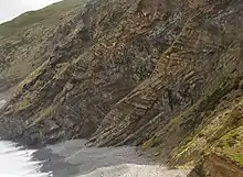 In structural geology, vergence refers to the direction of the overturned component of an asymmetric fold.[1] In simpler terms, vergence can be described as the horizontal direction in which the upper-component of rotation is directed.[2] Vergence can be observed and recorded in folds to help a geologist determine characteristics of larger fold areas.[1] Vergence is used to provide an overall characterization, in the symmetry (or asymmetry) of folds, and can be used to observe changes in small-scale structures in relation to the axis of a large fold.[3] The vergence of a fold lies parallel to the surrounding surfaces of a fold, so if these surrounding surfaces are not horizontal in nature, the vergence of the fold will be inclined. For a fold, the direction, as well as the extent to which vergence occurs, can be calculated from the strike and dip of the axial surfaces, along with that of the enveloping surfaces. These calculations can be very useful for geologists in determining the overall elements of larger areas.[1]
