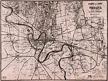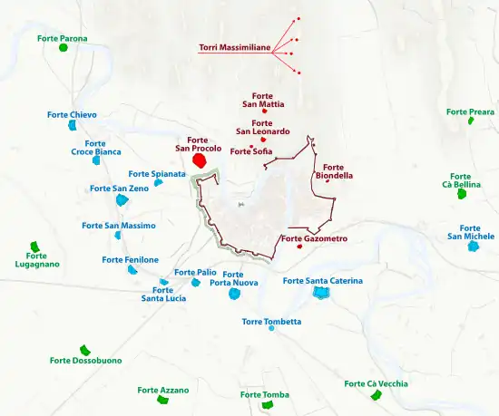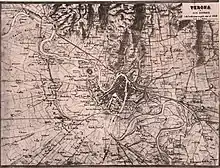 ![]() Austrian Verona in 1866, with the outer entrenched camp and the magisterial wall highlighted | |