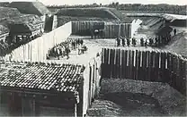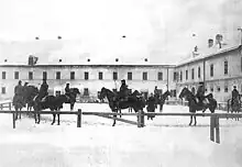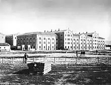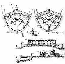 Specifically, for the first group of priorities, the following were built: the infantry and cavalry barracks; the supply establishments with related warehouses and various stores for provisions; the mounts establishments, with related warehouses and stores of clothing for soldiers and harnesses for horses; buildings and other establishments for fortress artillery; fortifications yard, in which all materials and equipment for the work of the engineers were kept, related warehouses and stores, with workshops and rooms for storing fire-fighting equipment. Furthermore, the garrison hospital, the stronghold command and the commander's residence with related personnel for the stronghold command, military justice, chaplain and military commissar; the directorate of engineering, with offices for engineer officers and technical construction personnel, and with the director's quarters; and finally the prisons were built.[39]