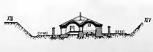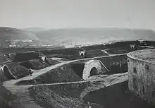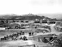 The firepower assigned to the curtain wall turned out to be considerable, so much so that even during the War of 1866, even though the entire entrenched camp outside the city was complete and in perfect working order, the armament of the Adige right curtain reached the number of 72 guns.[23] However, at the end of the reinforcement of the curtain walls, the tactical problem of the rideau, that is, the natural terracing extended from the built-up area of Santa Lucia and San Massimo to that of Chievo, west of the city, still remained unresolved, a line of natural emplacements against Verona from which, moreover, the enemy could have obstructed external sorties from the magisterial wall.[16][24]