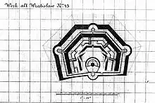 In the design and construction of the eight hill forts, von Scholl faced complex problems of adaptation to the morphology of the very rugged site, which he solved with forms of striking planimetric and volumetric articulation. Moreover, based on the eighteenth-century theories developed by Marc René de Montalembert and taking his cue from earlier Swedish artillery towers (built between 1689 and 1731), he worked out an original model of a fortification with a circular layout, integrated with an advanced polygonal enclosure. Archduke Maximilian's models for the Linz towers and almost coeval solutions for the coastal towers at Trieste and Pula also appear in von Scholl's design.[16]