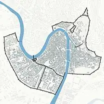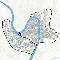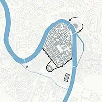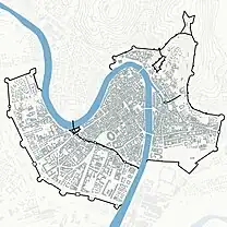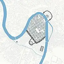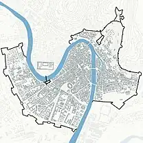 Monumental works forming a repertoire of nearly 2,000 years of the history of fortification art are still visible in the urban area, which is why the city has been decreed a UNESCO World Heritage Site;[2] the ruins of the Roman fortified city, the perimeter of the Scaliger walled city with its castles, the structure of the Venetian fortress, as well as the final layout of the Habsburg stronghold still remain. The magisterial wall, in its final arrangement, has a development of more than 9 km and occupies almost 100 ha of area with its structures: curtain walls, towers, allures, bastions, moats, terrepleins and glacis. Finally, in the surrounding area, located in the flat countryside or on the Torricelle hills, 31 forts (19 of which still exist) formed the last and most modern city system, which was the defense of the Habsburg stronghold.[3]