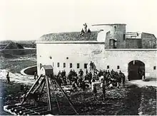 The same program of fortification integration of the magistral wall was also applied on the plain. On the left side of the Adige River, the construction of military works was required to make compatible the presence of the new monumental cemetery, built in front of the enclosure at the Campo Marzo bastion starting in 1828. A mighty two-story casemate tower-segment battery (or Segmentthurm) then was placed in front of the cemetery toward the Adige, while in 1838 a detached fort named after engineer von Scholl, who had given the design but died that same year during construction, was built about 150 m south of the cemetery. It was later more simply named Fort Gazometro, from the presence of such industrial plants a short distance away.[16][27]