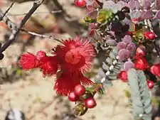 The flowers are arranged in spike-like groups on stalks 3–10 mm (0.1–0.4 in) long. The floral cup is top-shaped, 3–5 mm (0.1–0.2 in) long, glabrous and smooth with curved green appendages. The sepals are bright red, often creamish-green on their lower parts, 7–10 mm (0.3–0.4 in) long, with 8 to 16 feathery lobes. The petals are cream-coloured to pink when they open but become bright red, 6–10 mm (0.2–0.4 in) long, with a feathery edge and 2 ear-shaped appendages at their base. The style is 12–20 mm (0.5–0.8 in) long, gently curved, with simple hairs and extends well beyond the petals. Flowering time is from July to November or December.[2]