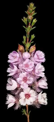 The flowers are lightly scented and arranged in spike-like groups, each flower on a stalk, 1.5–3 mm (0.06–0.1 in) long. The floral cup is top-shaped, 2–3 mm (0.08–0.1 in) long, glabrous, slightly warty and has two small green appendages. The sepals are pale pink to magenta-coloured, 3.5–4.5 mm (0.14–0.18 in) long, with 5 or 6 hairy lobes and two small ear-like appendages on the sides. The petals are similar in colour to the sepals, 3–5 mm (0.1–0.2 in) long and erect with short, coarse teeth along their top edge. The style is 4.5–5 mm (0.18–0.20 in) long and hairy near the tip. Flowering time is from September to December.[1]