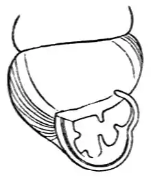 The buccal plate is wide, narrow, not produced in centre, but slightly curving at ends. The cutting edge is regularly waved.