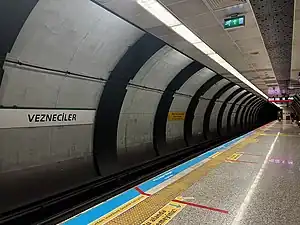 Vezneciler is a station on the M2 line of the Istanbul Metro.[2] The station is located under Şehzadebaşı Street and 16 Mart Şehitleri Street in the historical Fatih district of Istanbul. Opened on 16 March 2014, Vezneciler is the most recently opened station on the M2 line. During the inauguration the station was dedicated to Ottoman police officers who were killed during a conflict with British forces during the Occupation of Constantinople in 1920.[3][4] Istanbul University's main campus, Beyazıt Square and the Şehzade Mosque are a few landmarks in the vicinity of the station. On 7 June 2016, a bomb reportedly targeting a police bus struck around this station.[5]