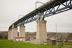 In order to minimize disruption to traffic, the steel bridge-deck sections were assembled off-site, directly beside the rail-freight marshalling yard at Montzen, and then transported the few kilometers to the bridge in order to be positioned using a specially prepared overhead crane structure (see picture). This exercise was undertaken, two deck-sections at a time, at approximately eight weekly intervals during a weekend "window" when the line was closed to traffic. Once the new bridge-deck had been completed, and the permanent replacement track laid the next year, the speed limit on the bridge was raised from 20 km/h (12 mph) to 60 km/h (37 mph).[1]