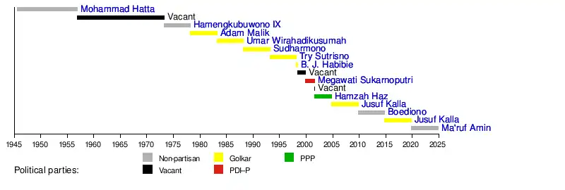 For the next 17 years, the vice presidency remained vacant. In December 1965, there were calls for a vice president to be named to assist President Sukarno during the times of uncertainty.[8] The idea did not gain momentum and the vice presidency continued to remain vacant as the presidency passed over from Sukarno to General Suharto.
