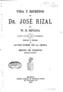 Vida y Escritos del Dr. José Rizal, translated as "Life and Writings of Dr. José Rizal”, is a biography of Rizal written by Wenceslao Emilio Retana y Gamboa, a 19th-century Spanish civil servant, colonial administrator, writer, publisher, bibliophile, Filipiniana collector, and Philippine scholar. The 512-page book was published by Librería General de Victoriano Suárez of Madrid, Spain, in 1907. It contains works of Rizal such as poems and essays in "Spanish of literary merit"; some "translations and short papers" written in Tagalog, German, French, and English; and a complete listing of Rizal’s writings.[1] The prologue for W.E. Retana’s book on Rizal was written by Javier Gómez de la Serna, while the epilogue was written by Miguel de Unamuno (1864–1936). Vida y Escritos del Dr. José Rizal is the first biographical account of the life of Rizal written by a non-Filipino author (the second is Rizal: Philippine Nationalist and Martyr by British author Austin Coates)..