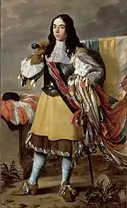 Boucquet had a refined technique which he put to use in his portraits. One of his most famous paintings The Standard Bearer (1664, Louvre) is signed 'Vigor Boucquet' and dated 1664. The work is traditionally believed to represent a person in military uniform. The standing figure holds over his shoulder a multicolored flag. On his armor, crossed by a red scarf fringed with gold, is spread a broad lace collar. His tunic of yellow leather covers a skirt in brown violet. The sleeves of his shirt are finely pleated. He wears blue stockings and a hat with white feathers is placed on a pedestal next to him. The swarthy complexion of the face, framed by long black hair, seems to denote a Spaniard. The countess of Comminges-Guitaud, who donated the painting to the Louvre, had bought the painting in Spain, which would point again to a Spanish sitter.[2] There is, however, no firm evidence that the depicted person is a Spaniard garrisoned in Veurne. It is very well possible that the portrait depicts a member of a local civic guard or a company of archers.[7]