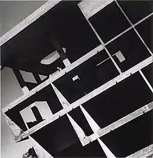 The design of the Villa Shodhan is structurally simplistic while still retaining plasticity in the treatment of the divided spaces. The overall frame of the building is in raw concrete, with clear markings of the wooden formwork. The frame is anchored to the ground, not elevated on stilts, a feature Le Corbusier used frequently in the 1920s.[8] Standard sheet metal is added to the underside of the interior ceilings and a protective parasol is used as the roof.[9][10] The design of the interior concrete piers, running to the full height of the building's elevation, is based around the architect's domino skeleton design established in 1915.[11] A ramp provides access to the main and mezzanine levels, while the rooms are grouped around a triple-height terrace. The ramp also leads to accompanying stairs, providing access to the roof and terrace.[12] The terrace plays an important role in the natural climate control process, cooling down the bedrooms in the middle of the day and providing an alternate sleeping area during the summertime.[13] Upon the parasol roof of Villa Shodhan, there is a garden abundant in thick grass and water troughs. The vision of dense greenery is also reinforced by overrun plants and trees, seeming to camouflage the building and its environment. The roof also features an oval aperture, which matches up with a hole in the lower slab roof, giving visitors a framed view of the sky. This is almost mimicked by the pool, situated at the base of the ramp, aiming to bring the outside in.[14]