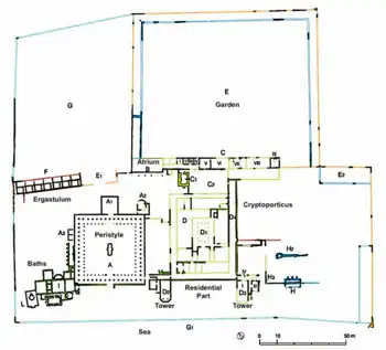 In the first phase (first half 1st c. BC to early 1st c. AD) the villa was built with two large contiguous blocks parallel to the beach.[8] The entrance from the coast on the south-west side gave a monumental view of the facade with two polygonal towers with several floors jutting out towards the sea and behind which was the residential area (D), while to the left was the large porticoed peristyle (A), the public part, with a double row of columns. The walls of the portico were painted red, at least in the lower part and facing its entrance from the beach on the opposite side of the quadriportico was an arch between the columns. The private, residential part had rooms around a small colonnaded atrium (D1) and was raised on the dunes, on a platform enlarged by a cryptoporticus so as to give a panoramic view over the sea. The main entrance was from the north through the atrium room B.